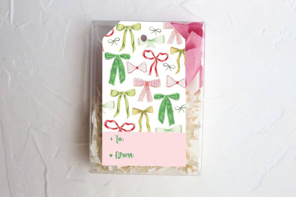 Festive bows gift tag set, ribbon, gift wrap supplies